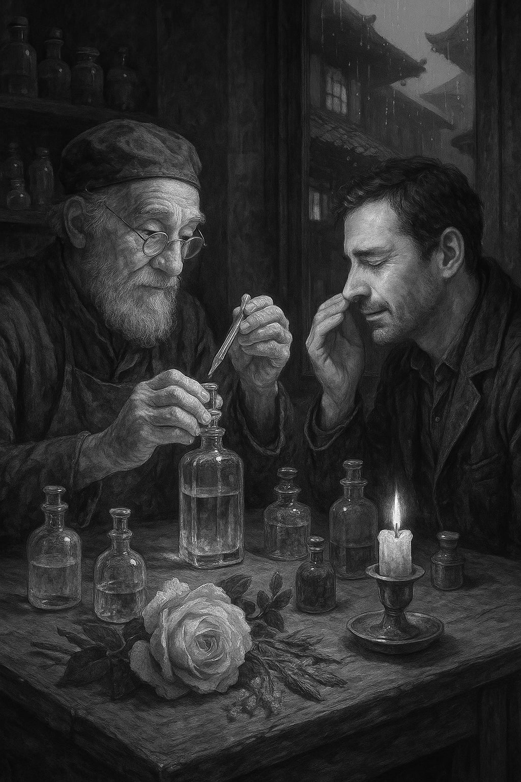 In a quiet village, an old perfumer was known for capturing memories in scent. One evening, a traveler arrived, searching for a fragrance he once encountered in the rain-soaked streets of Kyoto. It was a scent that held echoes of love, laughter, and a time that had slipped away.